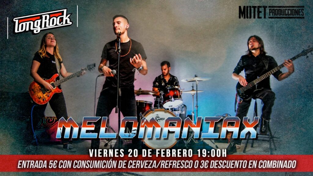 20/02/2026 @ 19:00 – Precio 5€ melomaniax Versiones de los grandes éxitos de la música nacional e internacional desde los 80 hasta ahora. * La hora de comienzo es aproximada. *No está permitida la entrada a menores de edad. *La entrada se compra en taquilla e incluye una consumición de Alhambra Especial o refresco.